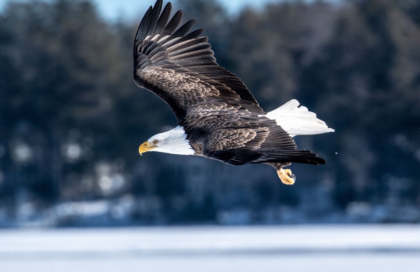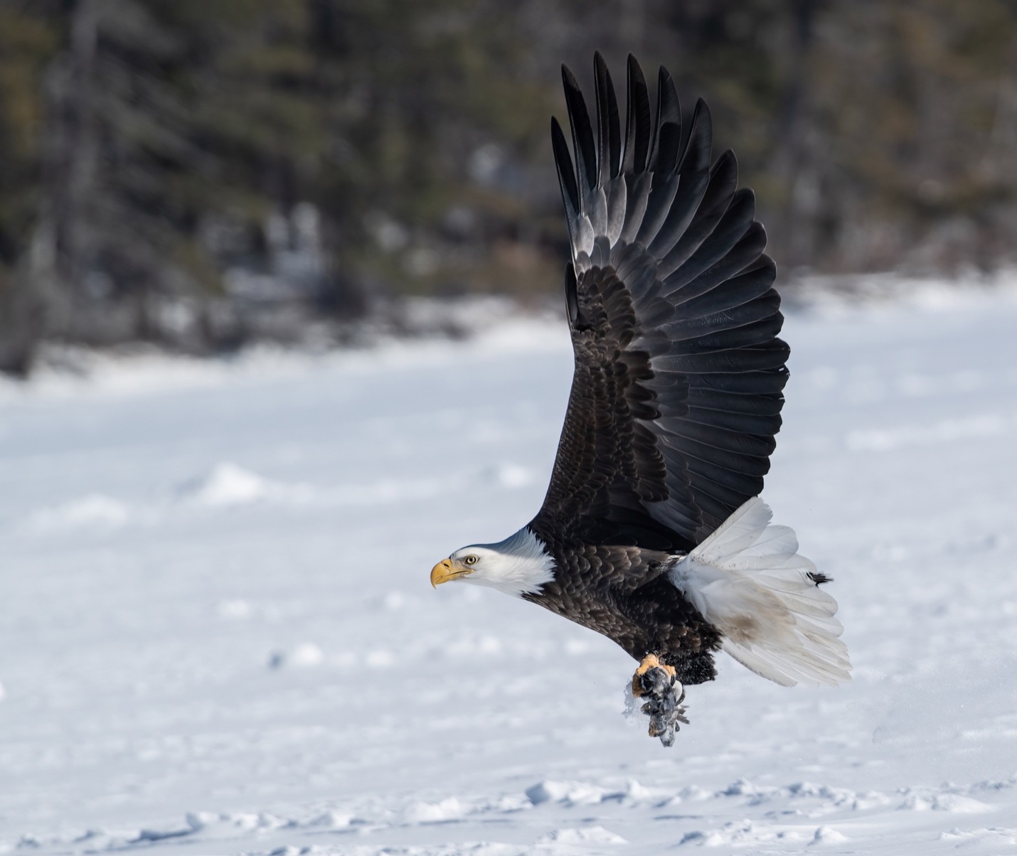 Off he flew. Such magnificence. Where to? I suspected to a tall tree to perch and eat, but no. He flew directly to a female eagle who was sitting on the ice a couple of hundred yards away. “Oh, look”, I thought, “he is going to share the fish with his friend. Isn’t that wonderful.”