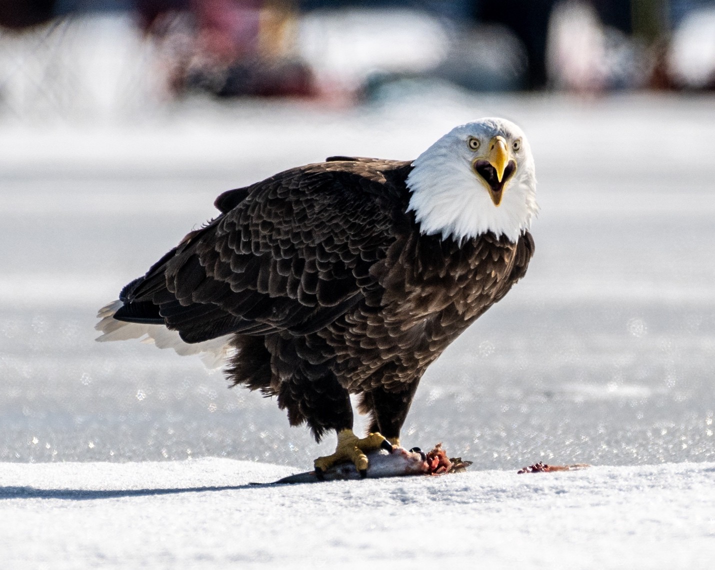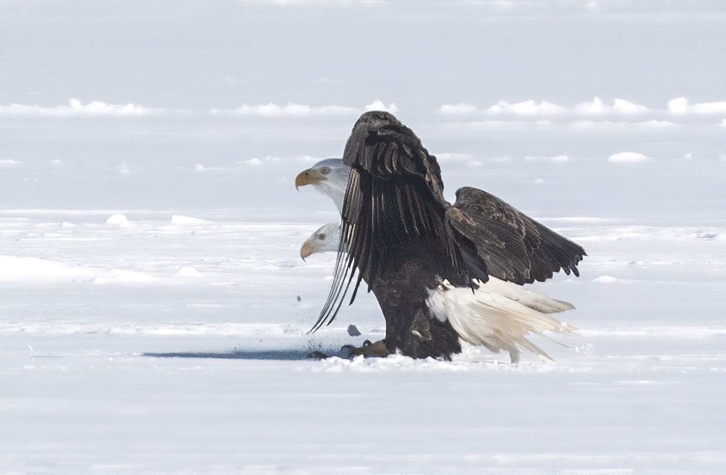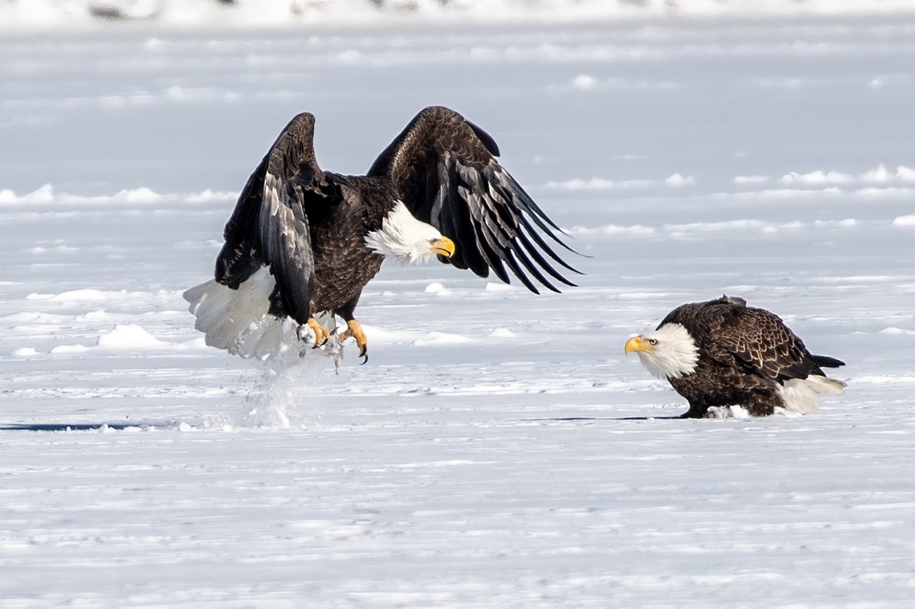 The ice fishermen were out over the weekend. I use the masculine “fishermen” not to be misogynistic, but simply because they were all males. One of the men left a fish on the ice for the eagles. It wasn’t long before the gift drew attention. The eagle spied the fish…