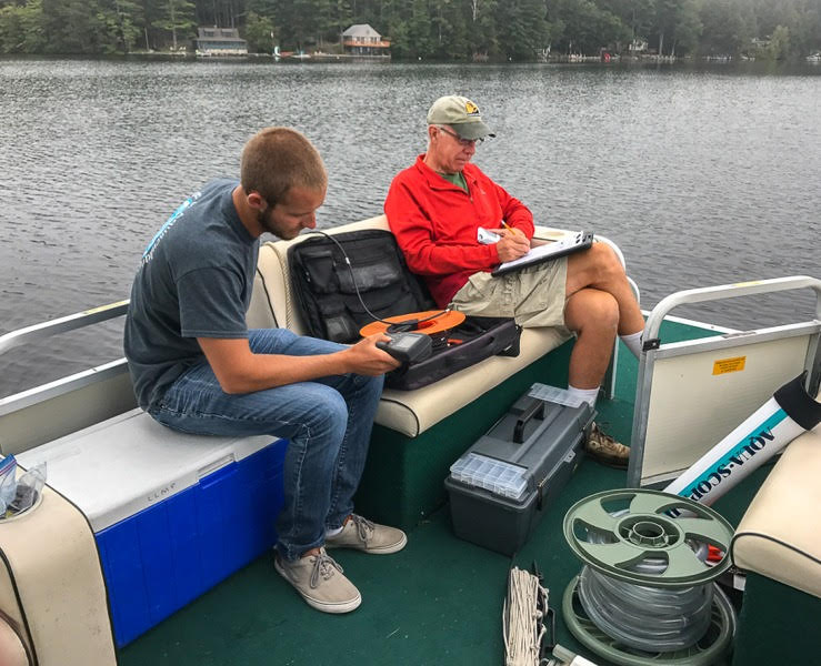 Erich Berghahn, an employee of the UNH Lakes Lay Monitoring Program (LLMP), is using an instrument to measure temperatures at various depths in the water column. Glenn Thornton is recording the data. Photo by Amy Arsenault, AWWA