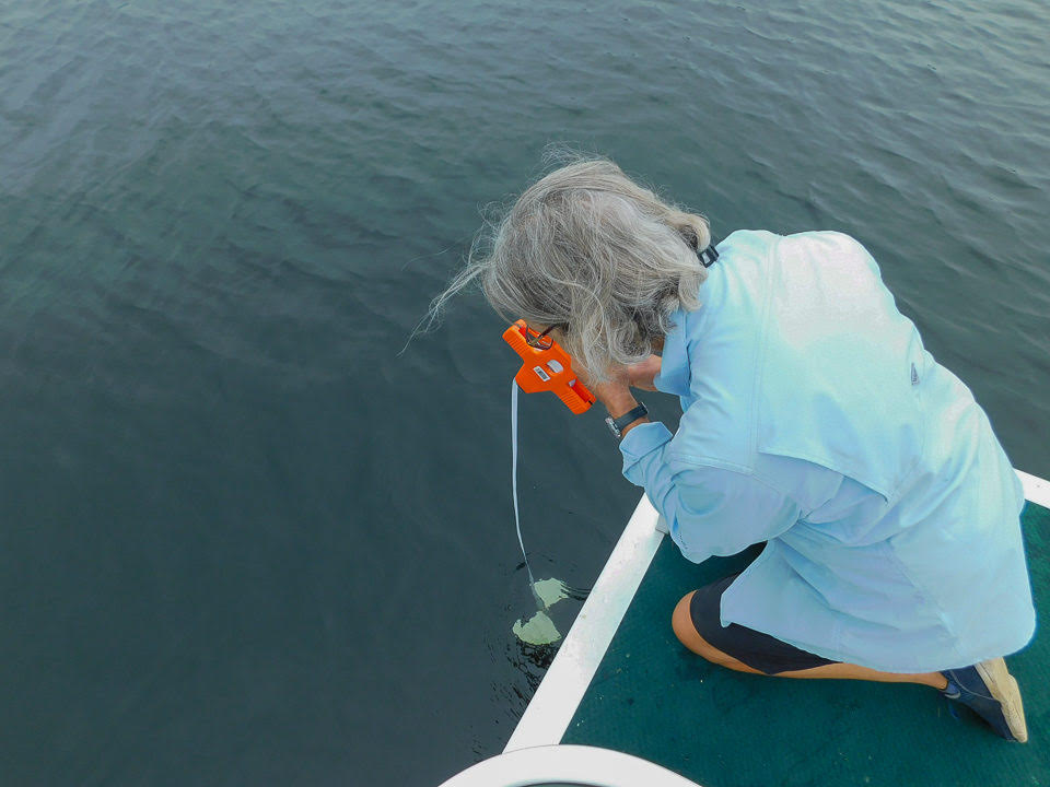 Stephanie Thornton is using a Secchi disc to measure the water transparency. Photo by Amy Arsenault, AWWA